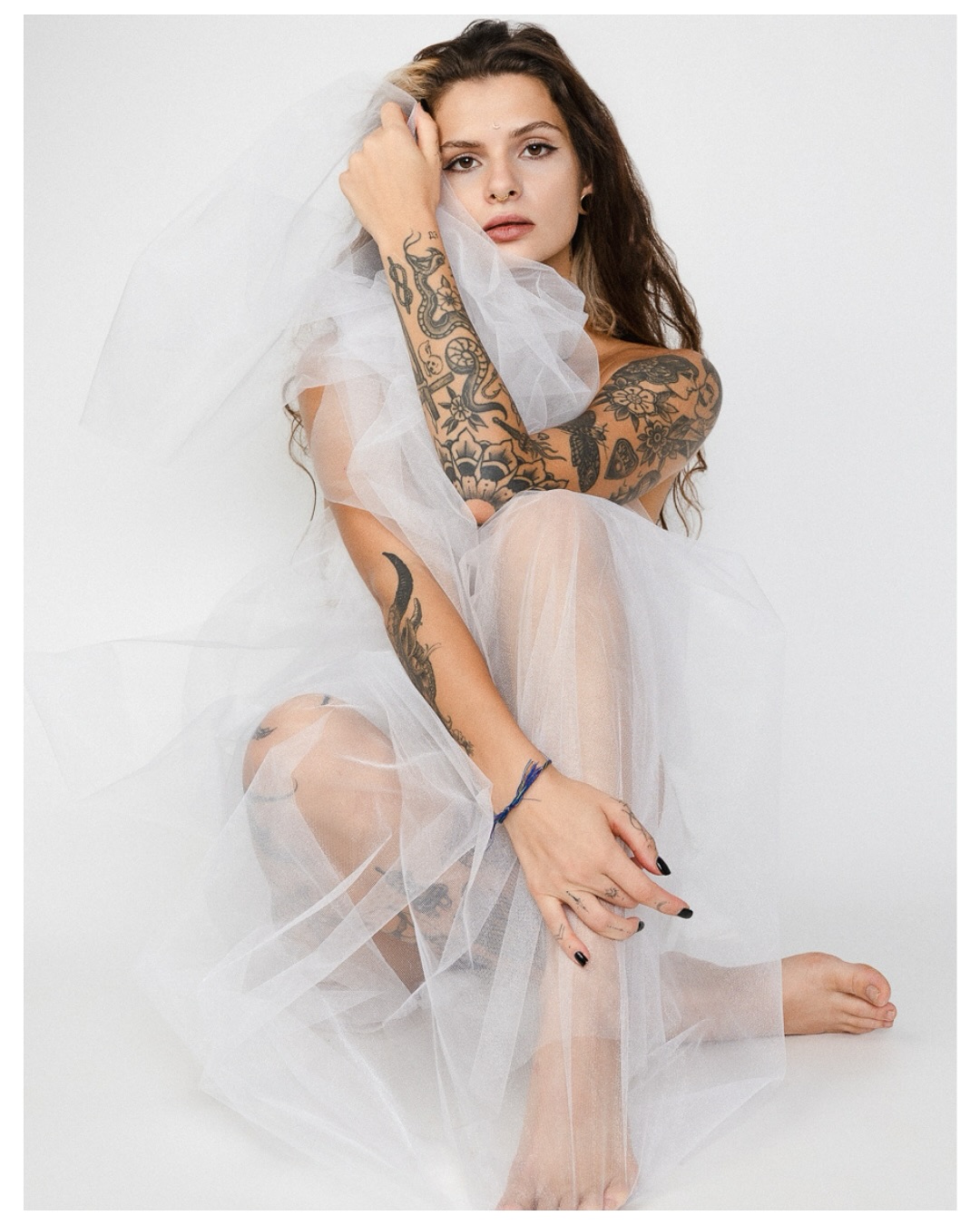 Julia's presence is a captivating blend of artistry and allure, drawing you in with a gaze that promises both mystery and power.